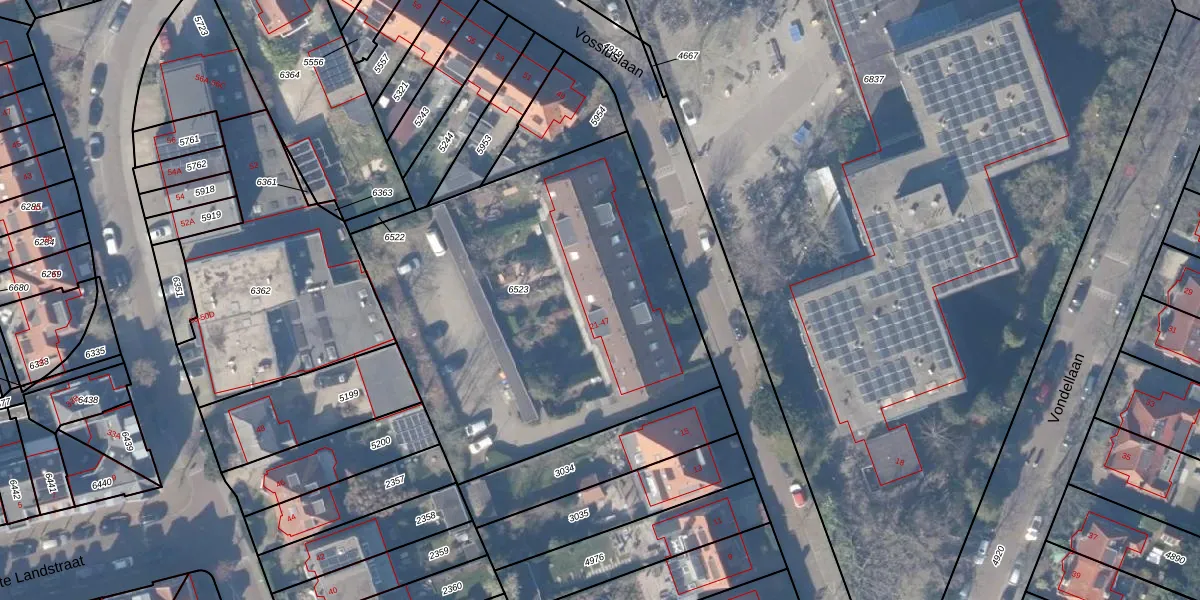 Het perceel waarop Vossiuslaan 39 staat heeft een oppervlakte van 2170 m². Dit is een zeer groot perceel. De perceeloppervlakte wordt geregistreerd door het Kadaster. Gedetailleerde informatie over de maten van dit perceel kunt u vinden in het rapport Kadastrale kaart met maatvoering van Vossiuslaan 39.