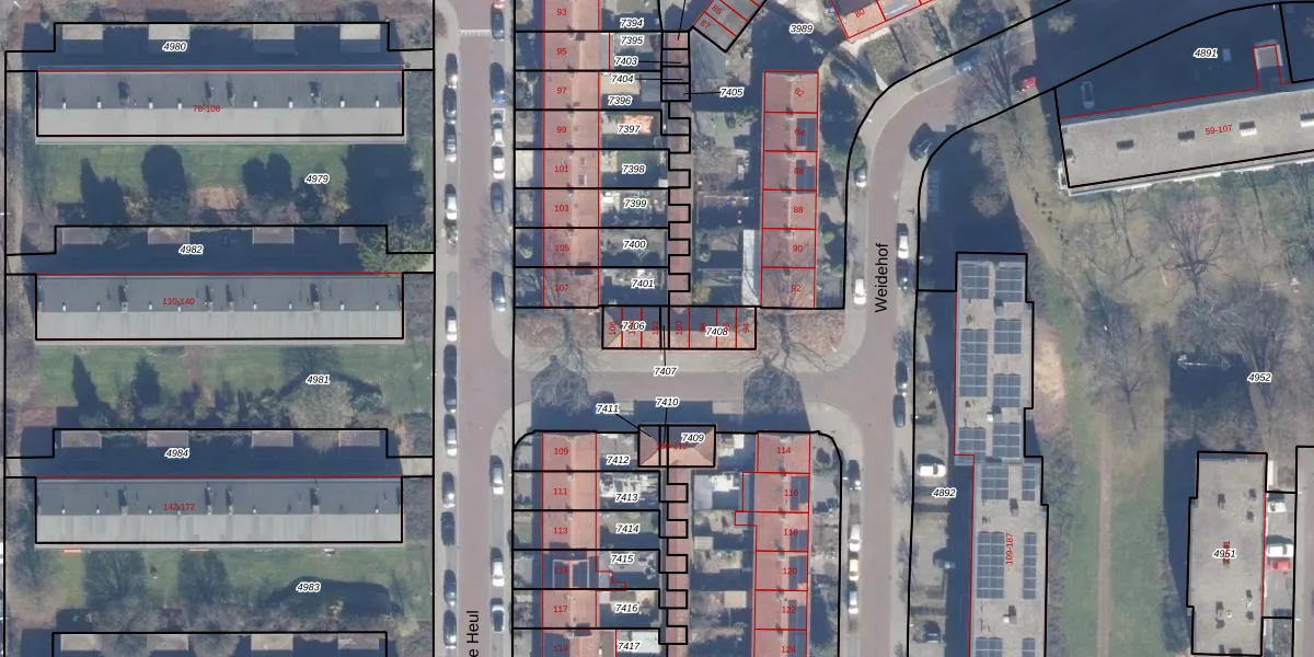 Het perceel waarop Weidehof 102 staat heeft een oppervlakte van 55 m². Dit is een klein perceel. De perceeloppervlakte wordt geregistreerd door het Kadaster. Gedetailleerde informatie over de maten van dit perceel kunt u vinden in het rapport Kadastrale kaart met maatvoering van Weidehof 102.