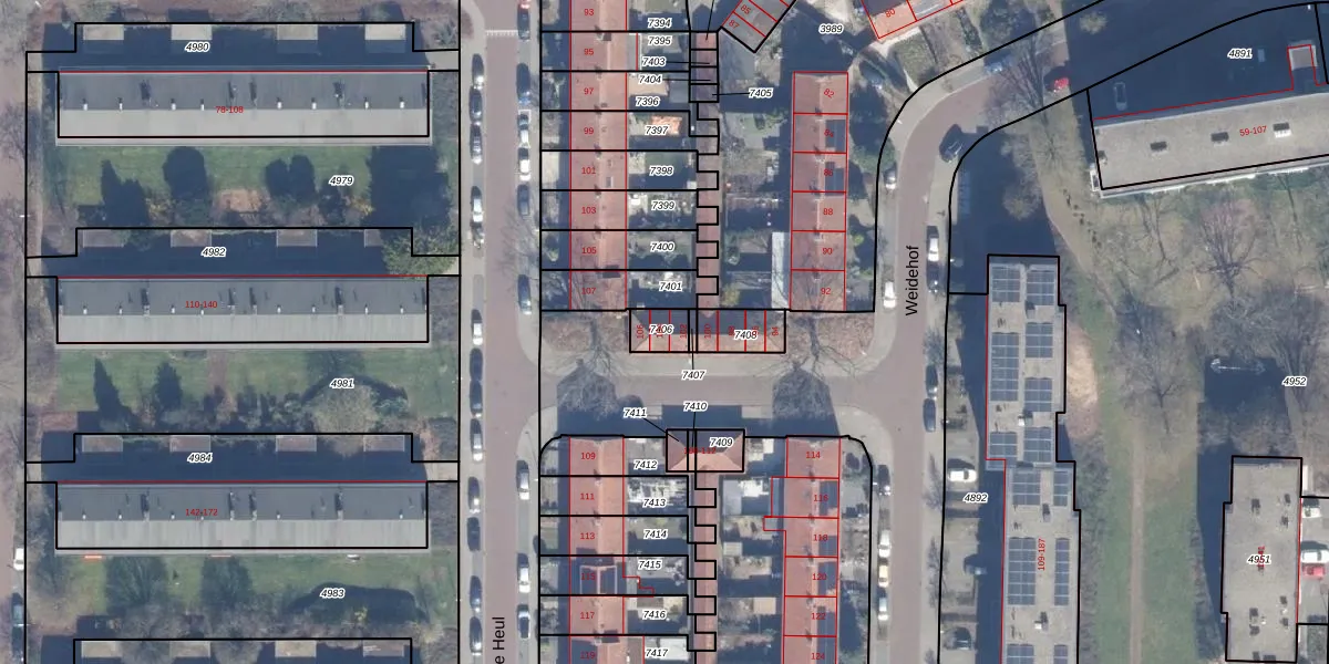 Het perceel waarop Weidehof 104 staat heeft een oppervlakte van 55 m². Dit is een klein perceel. De perceeloppervlakte wordt geregistreerd door het Kadaster. Gedetailleerde informatie over de maten van dit perceel kunt u vinden in het rapport Kadastrale kaart met maatvoering van Weidehof 104.