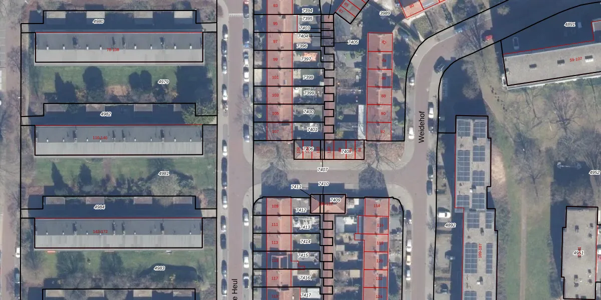 Het perceel waarop Weidehof 106 staat heeft een oppervlakte van 55 m². Dit is een klein perceel. De perceeloppervlakte wordt geregistreerd door het Kadaster. Gedetailleerde informatie over de maten van dit perceel kunt u vinden in het rapport Kadastrale kaart met maatvoering van Weidehof 106.