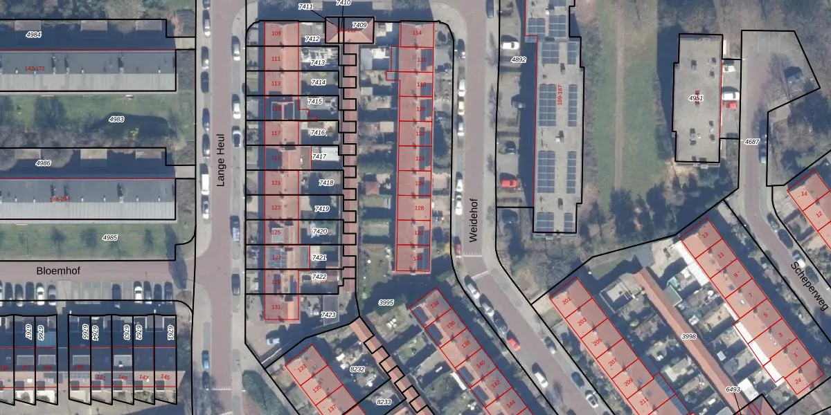 Het perceel waarop Weidehof 128 staat heeft een oppervlakte van 3137 m². Dit is een zeer groot perceel. De perceeloppervlakte wordt geregistreerd door het Kadaster. Gedetailleerde informatie over de maten van dit perceel kunt u vinden in het rapport Kadastrale kaart met maatvoering van Weidehof 128.