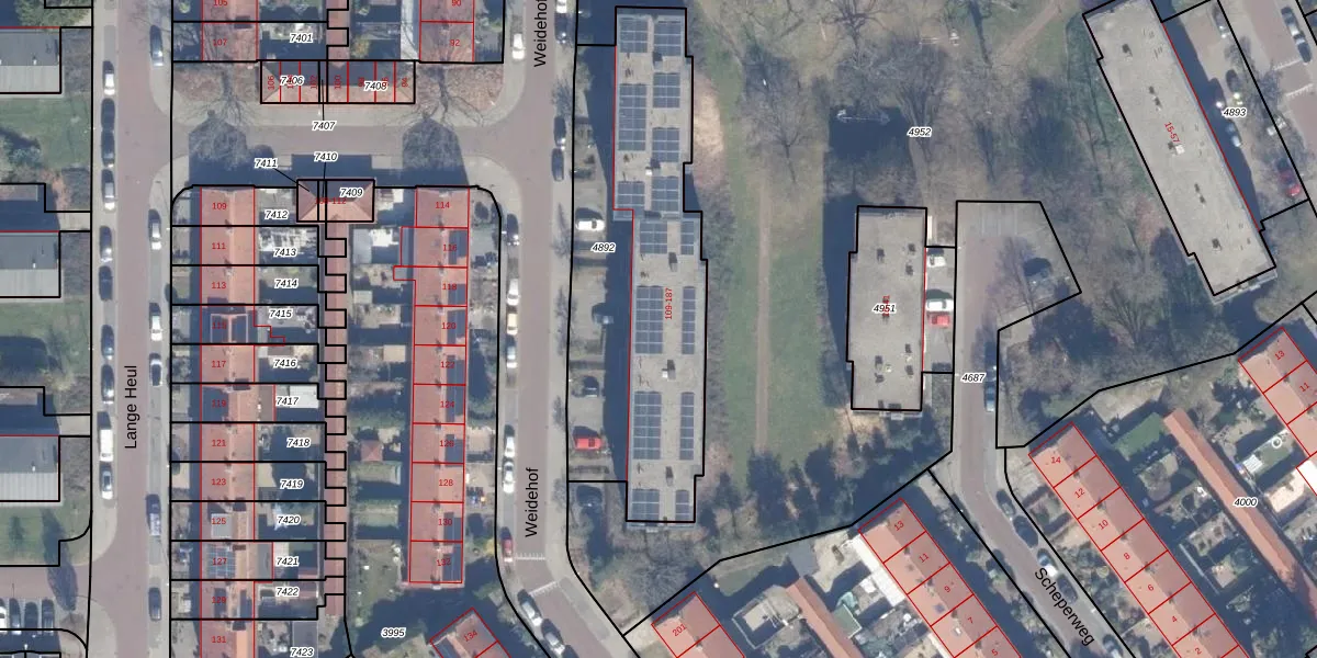 Het perceel waarop Weidehof 163 staat heeft een oppervlakte van 1397 m². Dit is een zeer groot perceel. De perceeloppervlakte wordt geregistreerd door het Kadaster. Gedetailleerde informatie over de maten van dit perceel kunt u vinden in het rapport Kadastrale kaart met maatvoering van Weidehof 163.
