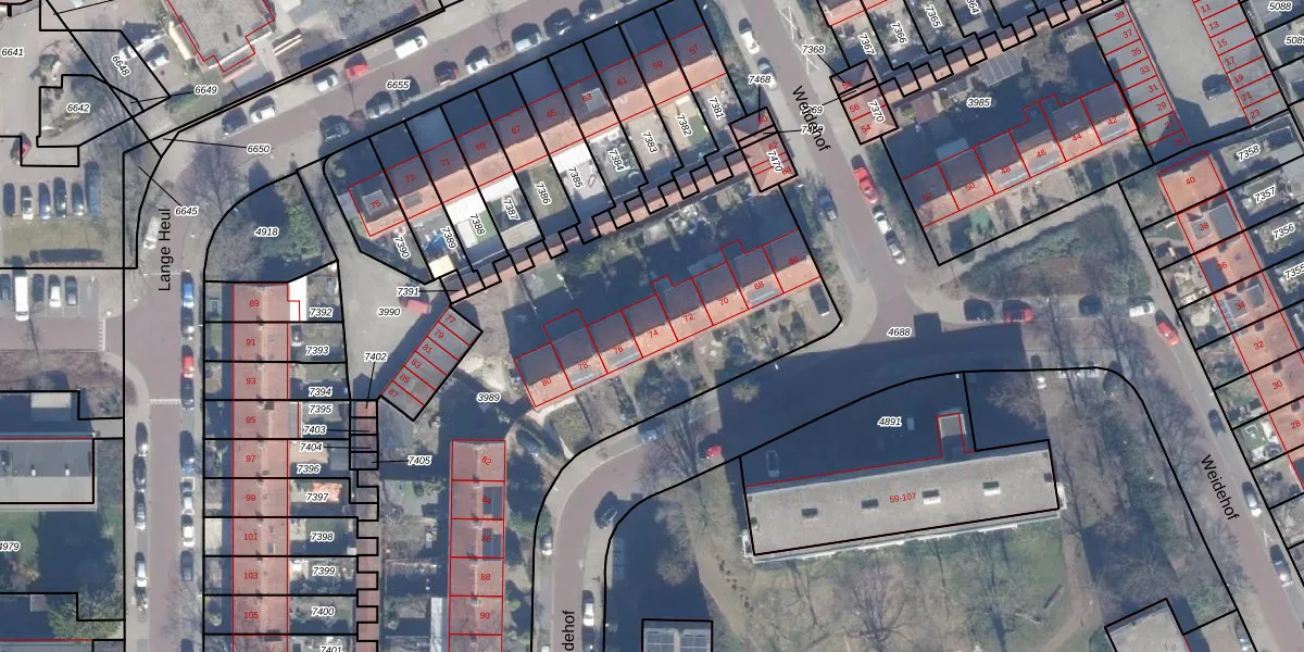 Het perceel waarop Weidehof 74 staat heeft een oppervlakte van 2668 m². Dit is een zeer groot perceel. De perceeloppervlakte wordt geregistreerd door het Kadaster. Gedetailleerde informatie over de maten van dit perceel kunt u vinden in het rapport Kadastrale kaart met maatvoering van Weidehof 74.