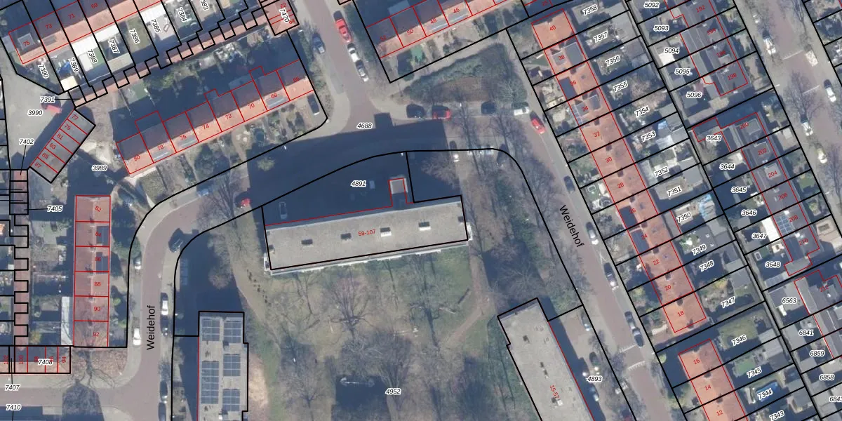 Het perceel waarop Weidehof 75 staat heeft een oppervlakte van 840 m². Dit is een groot perceel. De perceeloppervlakte wordt geregistreerd door het Kadaster. Gedetailleerde informatie over de maten van dit perceel kunt u vinden in het rapport Kadastrale kaart met maatvoering van Weidehof 75.