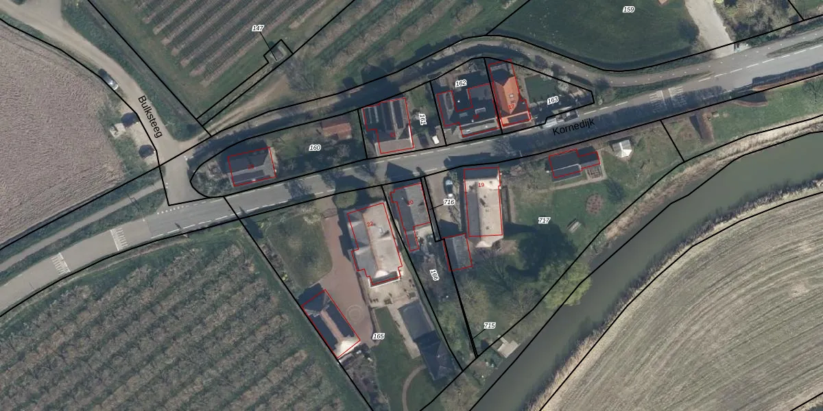 Kornedijk 20 is gelegen op kadastraal perceel BRN00O166. Deze kadastrale aanduiding is uniek en wordt gebruikt door het Kadaster om eigendomsrechten en andere zakelijke rechten vast te leggen. Het perceel maakt onderdeel uit van de kadastrale gemeente Buren.