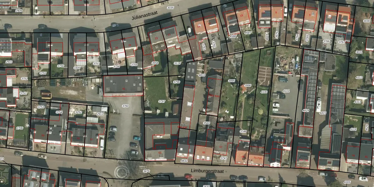 Het perceel waarop Limburgerstraat 63-B staat heeft een oppervlakte van 676 m². Dit is een groot perceel. De perceeloppervlakte wordt geregistreerd door het Kadaster. Gedetailleerde informatie over de maten van dit perceel kunt u vinden in het rapport Kadastrale kaart met maatvoering van Limburgerstraat 63-B.