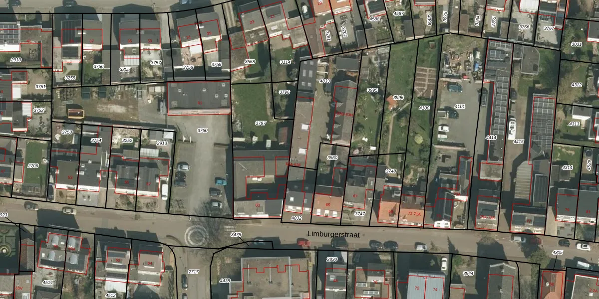 Het perceel waarop Limburgerstraat 63-F staat heeft een oppervlakte van 676 m². Dit is een groot perceel. De perceeloppervlakte wordt geregistreerd door het Kadaster. Gedetailleerde informatie over de maten van dit perceel kunt u vinden in het rapport Kadastrale kaart met maatvoering van Limburgerstraat 63-F.
