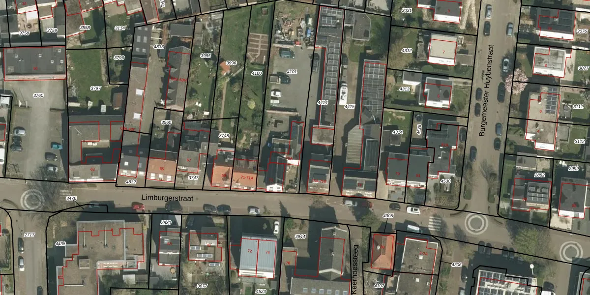 Het perceel waarop Limburgerstraat 73-B staat heeft een oppervlakte van 960 m². Dit is een groot perceel. De perceeloppervlakte wordt geregistreerd door het Kadaster. Gedetailleerde informatie over de maten van dit perceel kunt u vinden in het rapport Kadastrale kaart met maatvoering van Limburgerstraat 73-B.