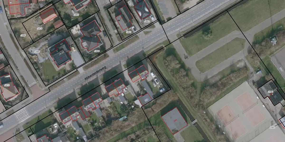 Het perceel waarop Abbestederweg 22 staat heeft een oppervlakte van 6420 m². Dit is een zeer groot perceel. De perceeloppervlakte wordt geregistreerd door het Kadaster. Gedetailleerde informatie over de maten van dit perceel kunt u vinden in het rapport Kadastrale kaart met maatvoering van Abbestederweg 22.