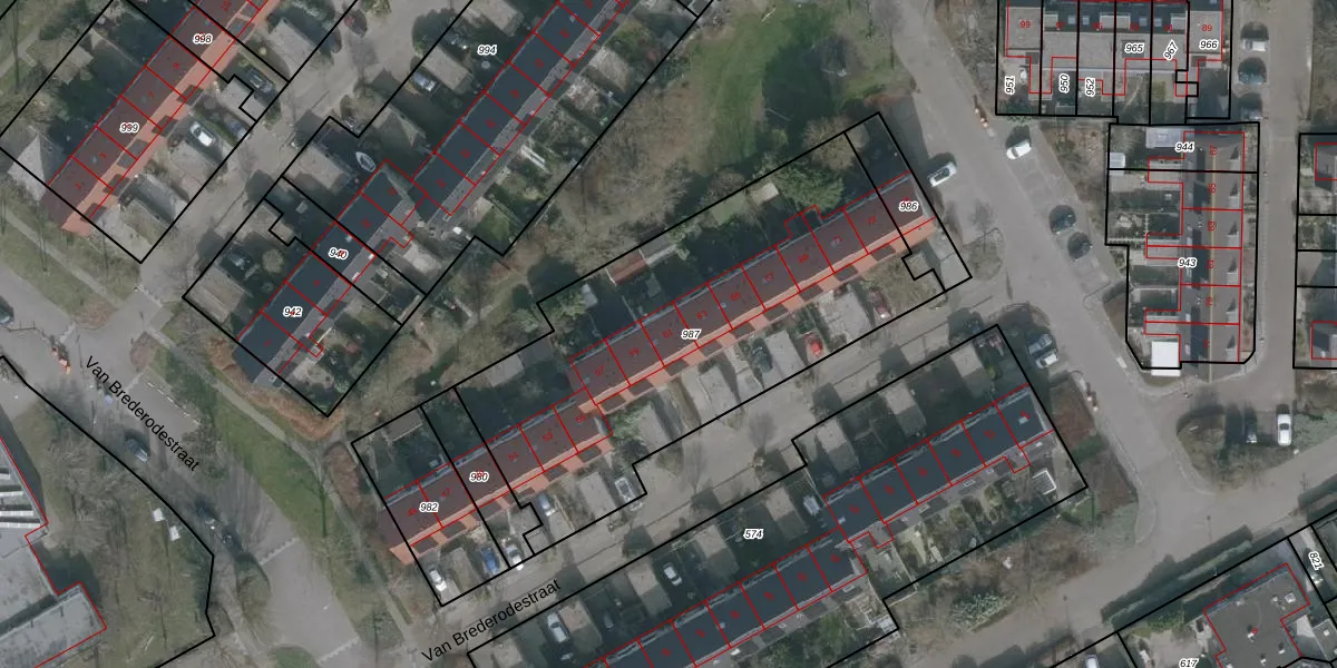 Het perceel waarop Van Brederodestraat 61 staat heeft een oppervlakte van 1960 m². Dit is een zeer groot perceel. De perceeloppervlakte wordt geregistreerd door het Kadaster. Gedetailleerde informatie over de maten van dit perceel kunt u vinden in het rapport Kadastrale kaart met maatvoering van Van Brederodestraat 61.