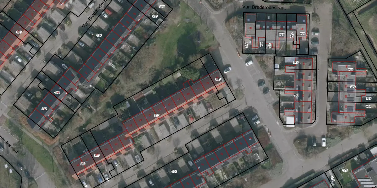 Het perceel waarop Van Brederodestraat 69 staat heeft een oppervlakte van 1960 m². Dit is een zeer groot perceel. De perceeloppervlakte wordt geregistreerd door het Kadaster. Gedetailleerde informatie over de maten van dit perceel kunt u vinden in het rapport Kadastrale kaart met maatvoering van Van Brederodestraat 69.