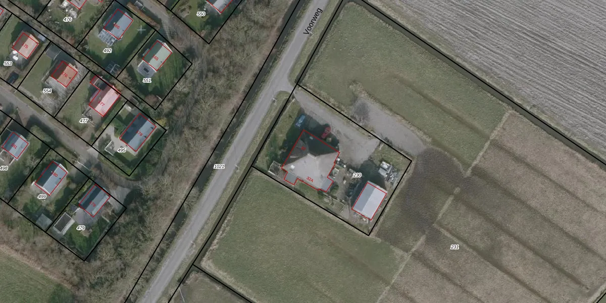 Het perceel waarop Voorweg 32 staat heeft een oppervlakte van 1315 m². Dit is een zeer groot perceel. De perceeloppervlakte wordt geregistreerd door het Kadaster. Gedetailleerde informatie over de maten van dit perceel kunt u vinden in het rapport Kadastrale kaart met maatvoering van Voorweg 32.