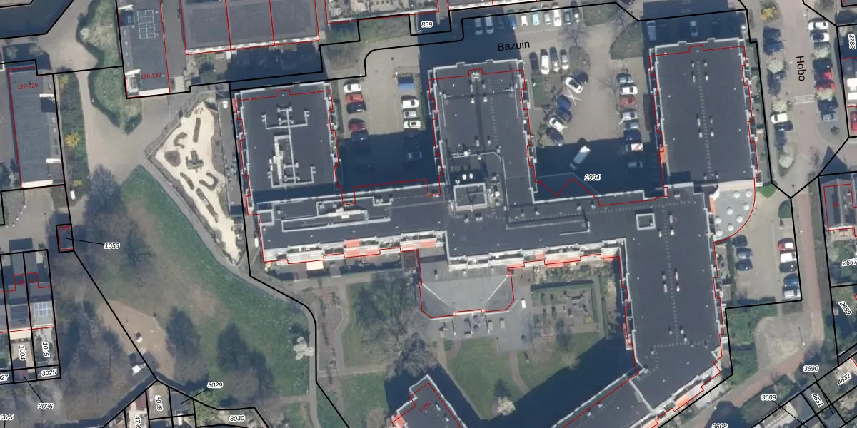 Het perceel waarop Bazuin 112 staat heeft een oppervlakte van 1,2 ha. Dit is een zeer groot perceel. De perceeloppervlakte wordt geregistreerd door het Kadaster. Gedetailleerde informatie over de maten van dit perceel kunt u vinden in het rapport Kadastrale kaart met maatvoering van Bazuin 112.