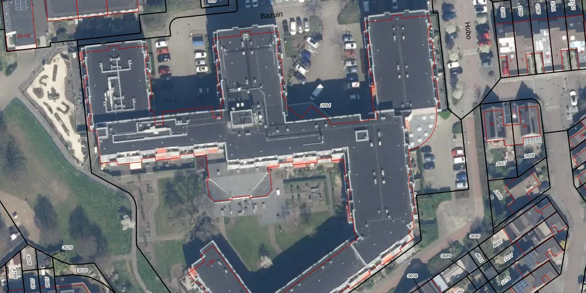 Het perceel waarop Bazuin 224 staat heeft een oppervlakte van 1,2 ha. Dit is een zeer groot perceel. De perceeloppervlakte wordt geregistreerd door het Kadaster. Gedetailleerde informatie over de maten van dit perceel kunt u vinden in het rapport Kadastrale kaart met maatvoering van Bazuin 224.