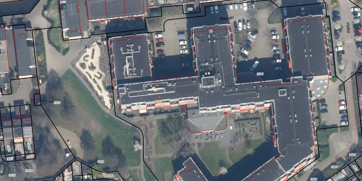 Het perceel waarop Bazuin 56 staat heeft een oppervlakte van 1,2 ha. Dit is een zeer groot perceel. De perceeloppervlakte wordt geregistreerd door het Kadaster. Gedetailleerde informatie over de maten van dit perceel kunt u vinden in het rapport Kadastrale kaart met maatvoering van Bazuin 56.