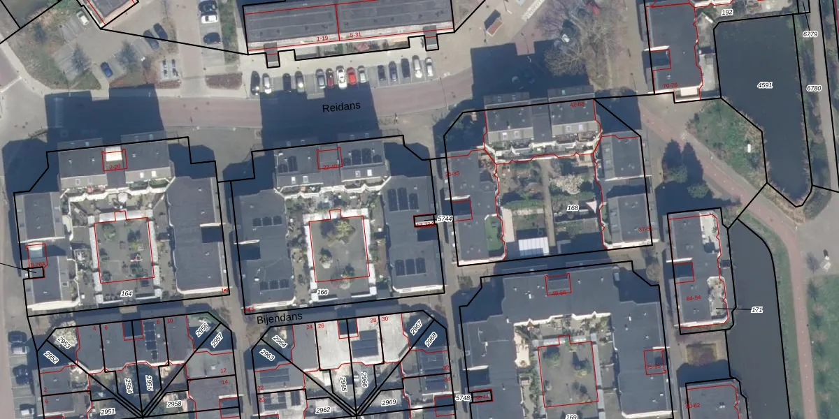 Het perceel waarop Bijendans 19 staat heeft een oppervlakte van 1762 m². Dit is een zeer groot perceel. De perceeloppervlakte wordt geregistreerd door het Kadaster. Gedetailleerde informatie over de maten van dit perceel kunt u vinden in het rapport Kadastrale kaart met maatvoering van Bijendans 19.