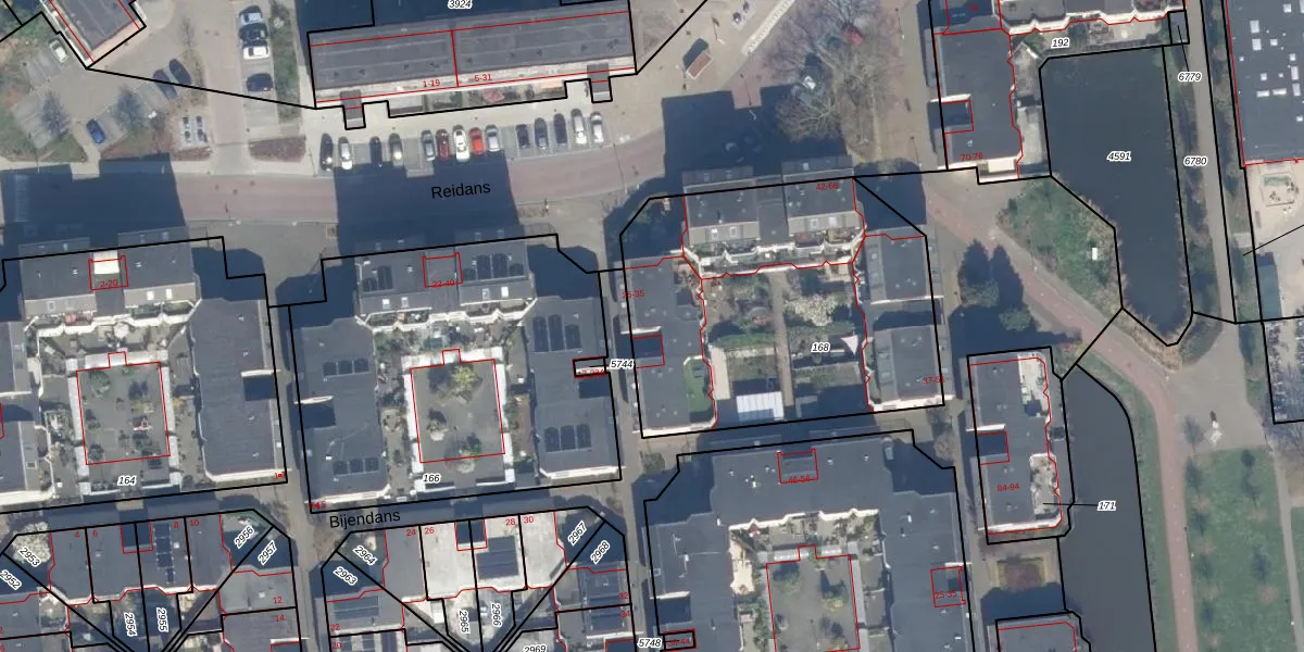 Het perceel waarop Bijendans 27 staat heeft een oppervlakte van 1622 m². Dit is een zeer groot perceel. De perceeloppervlakte wordt geregistreerd door het Kadaster. Gedetailleerde informatie over de maten van dit perceel kunt u vinden in het rapport Kadastrale kaart met maatvoering van Bijendans 27.