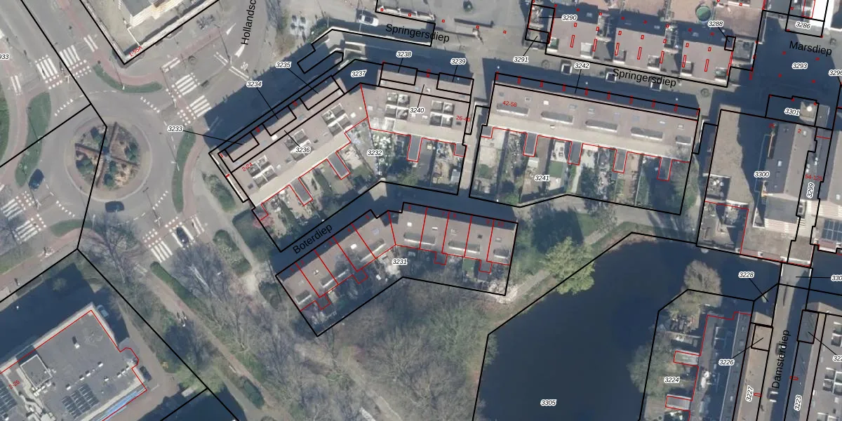 Het perceel waarop Boterdiep 6 staat heeft een oppervlakte van 972 m². Dit is een groot perceel. De perceeloppervlakte wordt geregistreerd door het Kadaster. Gedetailleerde informatie over de maten van dit perceel kunt u vinden in het rapport Kadastrale kaart met maatvoering van Boterdiep 6.