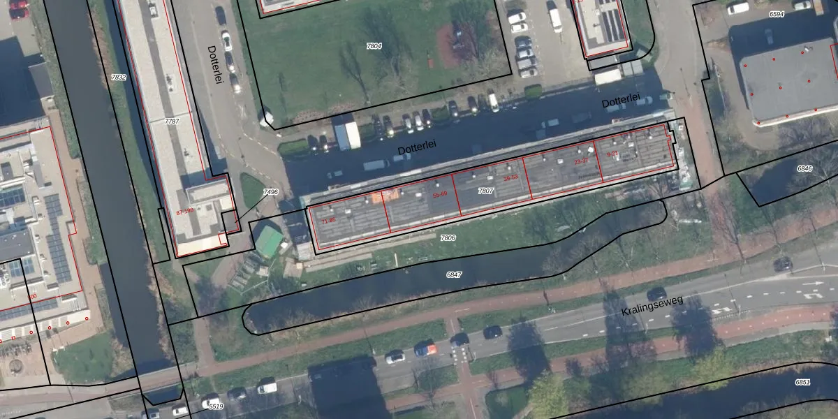 Het perceel waarop Dotterlei 63 staat heeft een oppervlakte van 1045 m². Dit is een zeer groot perceel. De perceeloppervlakte wordt geregistreerd door het Kadaster. Gedetailleerde informatie over de maten van dit perceel kunt u vinden in het rapport Kadastrale kaart met maatvoering van Dotterlei 63.