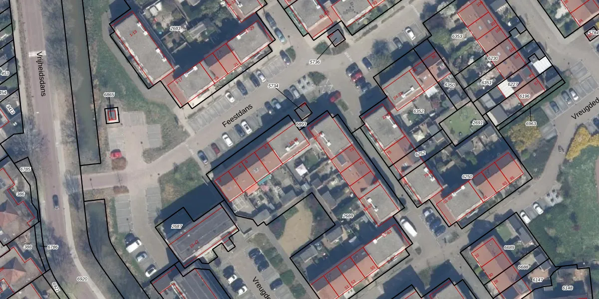 Het perceel waarop Feestdans 10 staat heeft een oppervlakte van 2245 m². Dit is een zeer groot perceel. De perceeloppervlakte wordt geregistreerd door het Kadaster. Gedetailleerde informatie over de maten van dit perceel kunt u vinden in het rapport Kadastrale kaart met maatvoering van Feestdans 10.