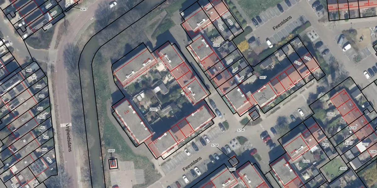 Het perceel waarop Feestdans 33 staat heeft een oppervlakte van 2315 m². Dit is een zeer groot perceel. De perceeloppervlakte wordt geregistreerd door het Kadaster. Gedetailleerde informatie over de maten van dit perceel kunt u vinden in het rapport Kadastrale kaart met maatvoering van Feestdans 33.