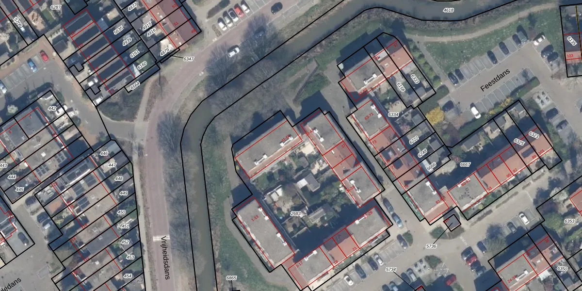 Het perceel waarop Feestdans 41 staat heeft een oppervlakte van 2315 m². Dit is een zeer groot perceel. De perceeloppervlakte wordt geregistreerd door het Kadaster. Gedetailleerde informatie over de maten van dit perceel kunt u vinden in het rapport Kadastrale kaart met maatvoering van Feestdans 41.
