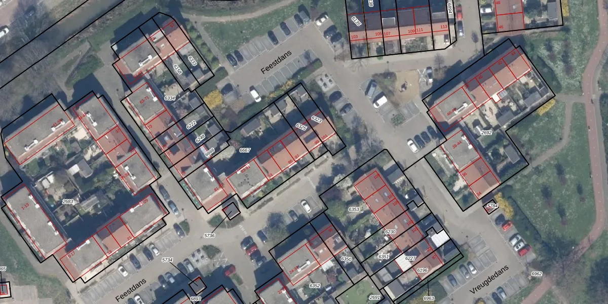 Het perceel waarop Feestdans 97 staat heeft een oppervlakte van 806 m². Dit is een groot perceel. De perceeloppervlakte wordt geregistreerd door het Kadaster. Gedetailleerde informatie over de maten van dit perceel kunt u vinden in het rapport Kadastrale kaart met maatvoering van Feestdans 97.