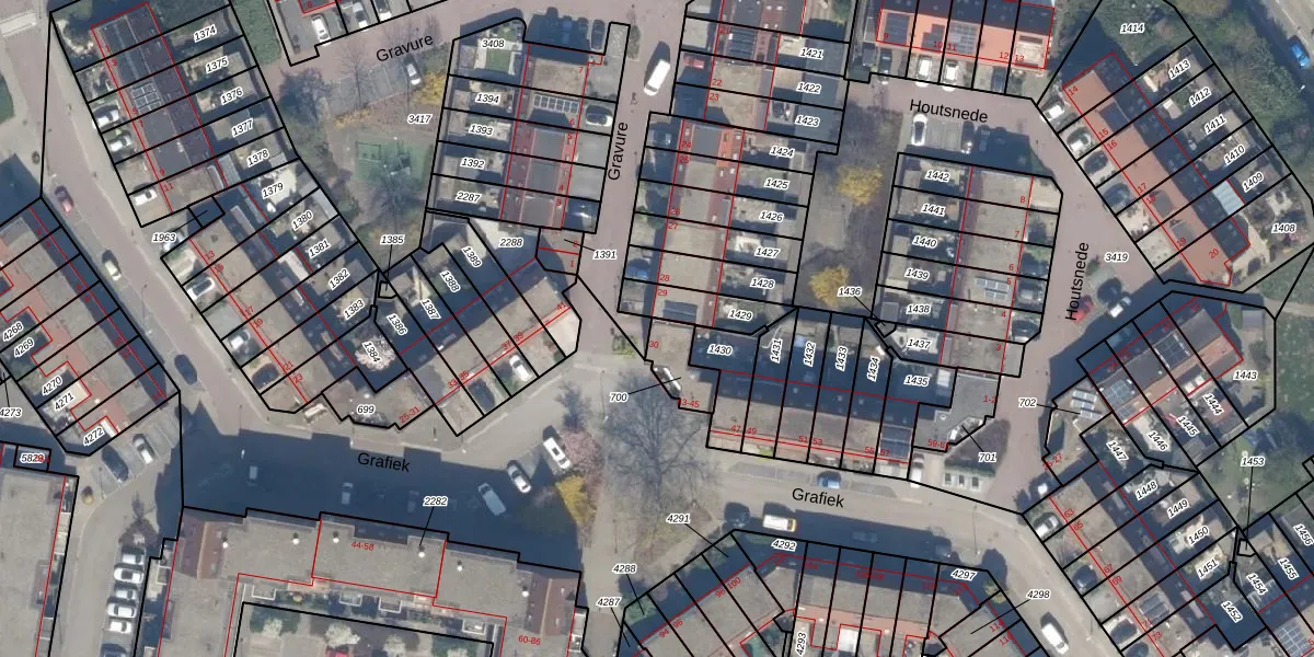 Het perceel waarop Gravure 30 staat heeft een oppervlakte van 98 m². Dit is een klein perceel. De perceeloppervlakte wordt geregistreerd door het Kadaster. Gedetailleerde informatie over de maten van dit perceel kunt u vinden in het rapport Kadastrale kaart met maatvoering van Gravure 30.