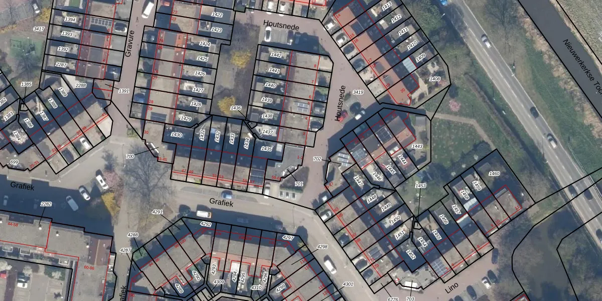 Het perceel waarop Houtsnede 2 staat heeft een oppervlakte van 98 m². Dit is een klein perceel. De perceeloppervlakte wordt geregistreerd door het Kadaster. Gedetailleerde informatie over de maten van dit perceel kunt u vinden in het rapport Kadastrale kaart met maatvoering van Houtsnede 2.