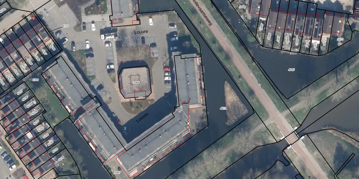 Het perceel waarop Louvre 142 staat heeft een oppervlakte van 2337 m². Dit is een zeer groot perceel. De perceeloppervlakte wordt geregistreerd door het Kadaster. Gedetailleerde informatie over de maten van dit perceel kunt u vinden in het rapport Kadastrale kaart met maatvoering van Louvre 142.