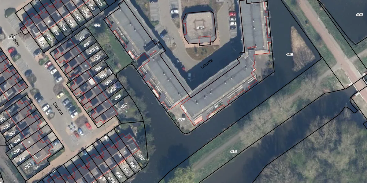Het perceel waarop Louvre 66 staat heeft een oppervlakte van 2337 m². Dit is een zeer groot perceel. De perceeloppervlakte wordt geregistreerd door het Kadaster. Gedetailleerde informatie over de maten van dit perceel kunt u vinden in het rapport Kadastrale kaart met maatvoering van Louvre 66.