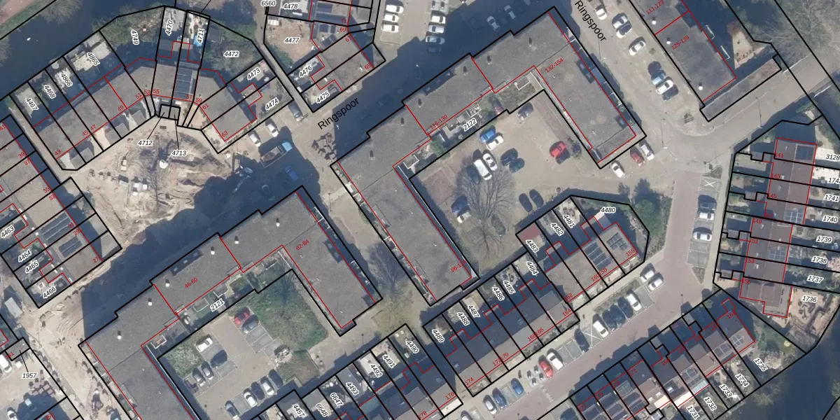 Het perceel waarop Ringspoor 100 staat heeft een oppervlakte van 1685 m². Dit is een zeer groot perceel. De perceeloppervlakte wordt geregistreerd door het Kadaster. Gedetailleerde informatie over de maten van dit perceel kunt u vinden in het rapport Kadastrale kaart met maatvoering van Ringspoor 100.