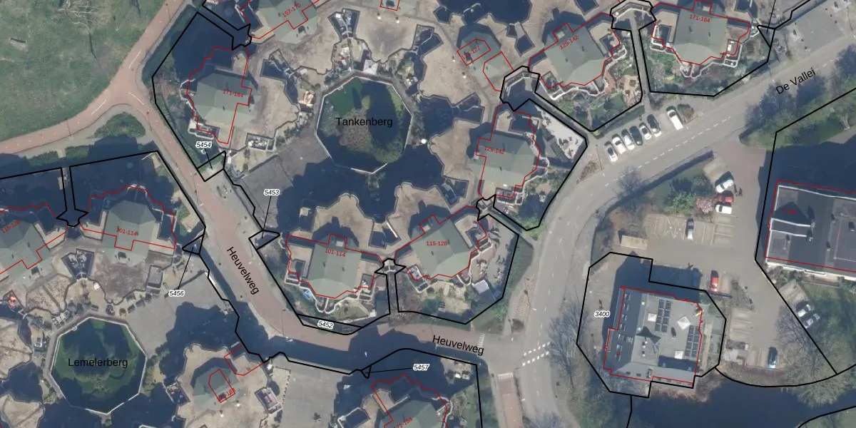 Het perceel waarop Tankenberg 121 staat heeft een oppervlakte van 1,5 ha. Dit is een zeer groot perceel. De perceeloppervlakte wordt geregistreerd door het Kadaster. Gedetailleerde informatie over de maten van dit perceel kunt u vinden in het rapport Kadastrale kaart met maatvoering van Tankenberg 121.