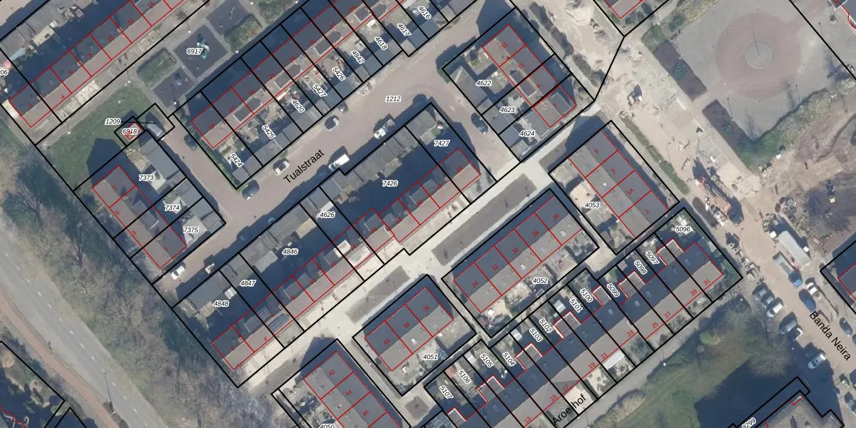 Het perceel waarop Tualstraat 20 staat heeft een oppervlakte van 592 m². Dit is een groot perceel. De perceeloppervlakte wordt geregistreerd door het Kadaster. Gedetailleerde informatie over de maten van dit perceel kunt u vinden in het rapport Kadastrale kaart met maatvoering van Tualstraat 20.