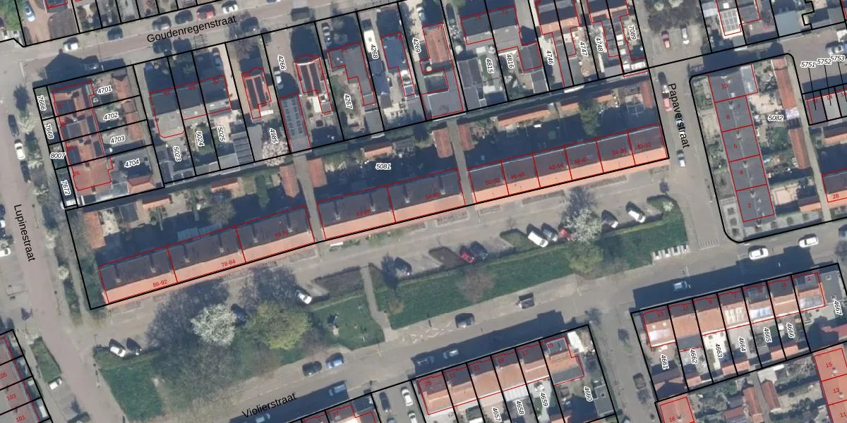 Het perceel waarop Violierstraat 56 staat heeft een oppervlakte van 3171 m². Dit is een zeer groot perceel. De perceeloppervlakte wordt geregistreerd door het Kadaster. Gedetailleerde informatie over de maten van dit perceel kunt u vinden in het rapport Kadastrale kaart met maatvoering van Violierstraat 56.