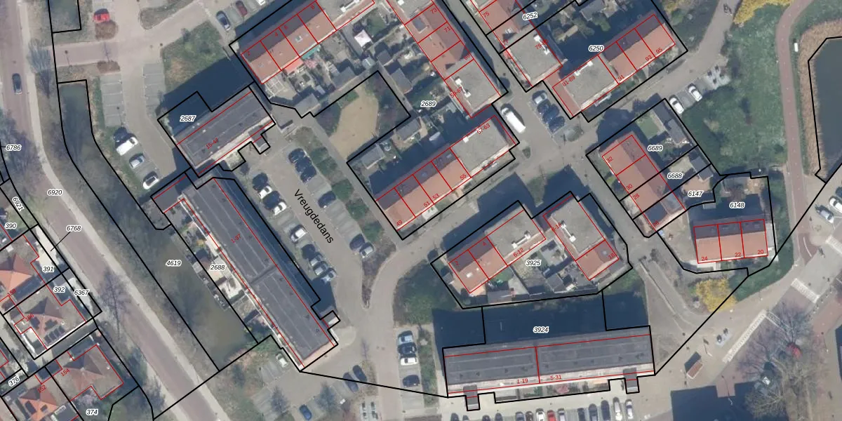 Het perceel waarop Vreugdedans 51 staat heeft een oppervlakte van 2245 m². Dit is een zeer groot perceel. De perceeloppervlakte wordt geregistreerd door het Kadaster. Gedetailleerde informatie over de maten van dit perceel kunt u vinden in het rapport Kadastrale kaart met maatvoering van Vreugdedans 51.