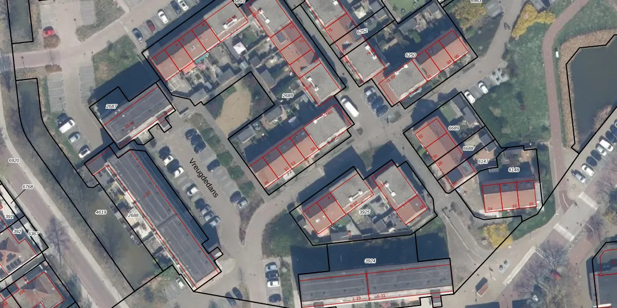 Het perceel waarop Vreugdedans 55 staat heeft een oppervlakte van 2245 m². Dit is een zeer groot perceel. De perceeloppervlakte wordt geregistreerd door het Kadaster. Gedetailleerde informatie over de maten van dit perceel kunt u vinden in het rapport Kadastrale kaart met maatvoering van Vreugdedans 55.