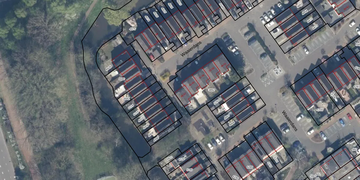 Het perceel waarop Waaierdans 65 staat heeft een oppervlakte van 825 m². Dit is een groot perceel. De perceeloppervlakte wordt geregistreerd door het Kadaster. Gedetailleerde informatie over de maten van dit perceel kunt u vinden in het rapport Kadastrale kaart met maatvoering van Waaierdans 65.