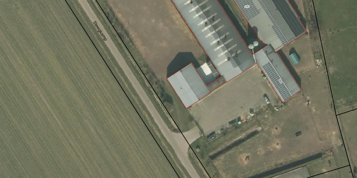 Het perceel waarop Steegkamp 5 staat heeft een oppervlakte van 2,1 ha. Dit is een zeer groot perceel. De perceeloppervlakte wordt geregistreerd door het Kadaster. Gedetailleerde informatie over de maten van dit perceel kunt u vinden in het rapport Kadastrale kaart met maatvoering van Steegkamp 5.