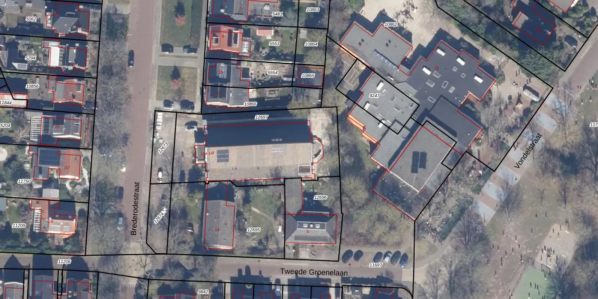 Het perceel waarop Brederodestraat 14-c staat heeft een oppervlakte van 1302 m². Dit is een zeer groot perceel. De perceeloppervlakte wordt geregistreerd door het Kadaster. Gedetailleerde informatie over de maten van dit perceel kunt u vinden in het rapport Kadastrale kaart met maatvoering van Brederodestraat 14-c.