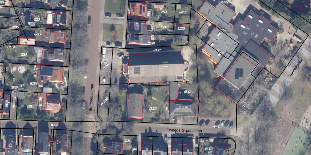 Het perceel waarop Brederodestraat 14-d staat heeft een oppervlakte van 1302 m². Dit is een zeer groot perceel. De perceeloppervlakte wordt geregistreerd door het Kadaster. Gedetailleerde informatie over de maten van dit perceel kunt u vinden in het rapport Kadastrale kaart met maatvoering van Brederodestraat 14-d.
