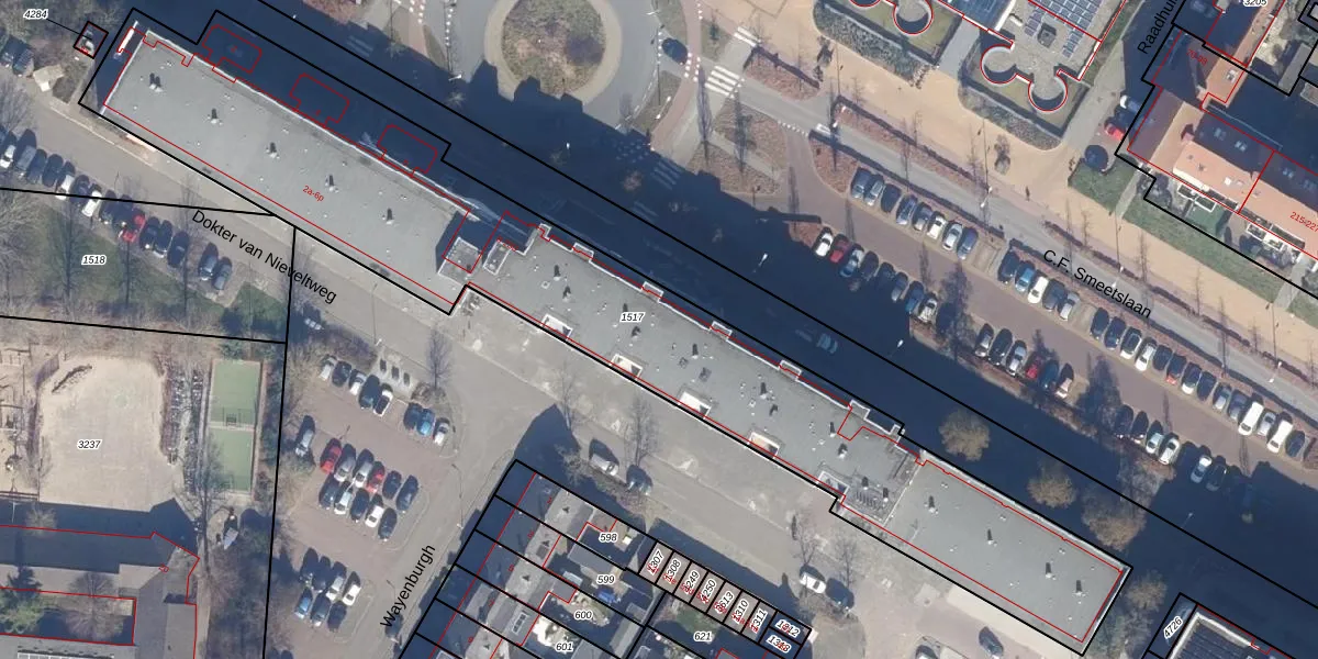 Het perceel waarop C.F. Smeetslaan 152 staat heeft een oppervlakte van 2970 m². Dit is een zeer groot perceel. De perceeloppervlakte wordt geregistreerd door het Kadaster. Gedetailleerde informatie over de maten van dit perceel kunt u vinden in het rapport Kadastrale kaart met maatvoering van C.F. Smeetslaan 152.