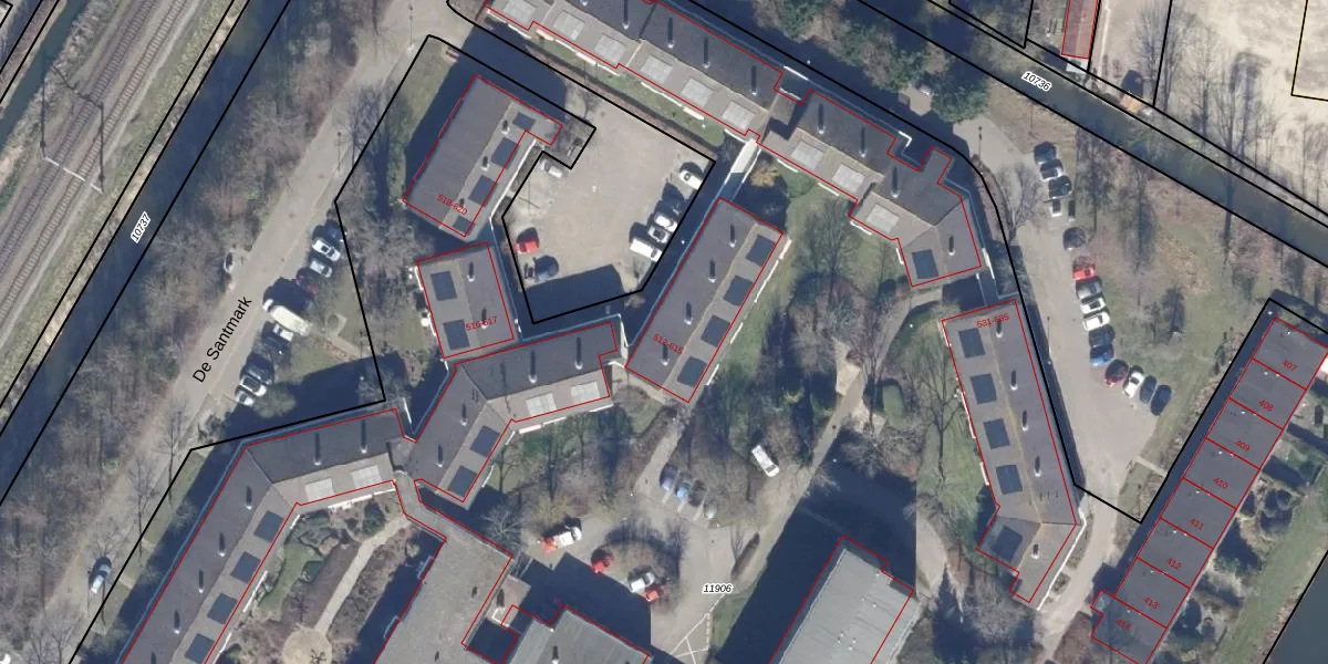 Het perceel waarop De Santmark 612 staat heeft een oppervlakte van 2,1 ha. Dit is een zeer groot perceel. De perceeloppervlakte wordt geregistreerd door het Kadaster. Gedetailleerde informatie over de maten van dit perceel kunt u vinden in het rapport Kadastrale kaart met maatvoering van De Santmark 612.