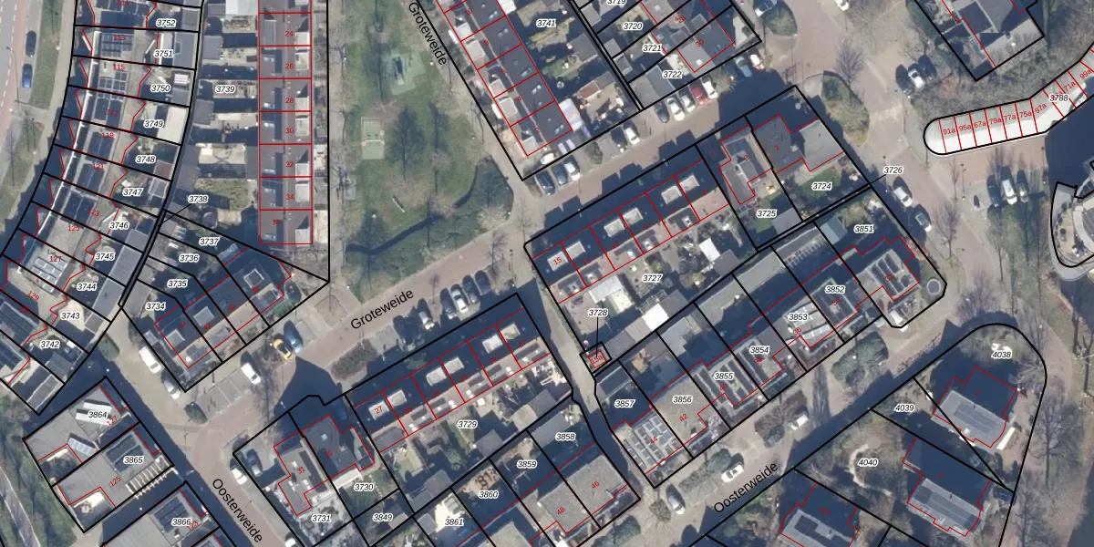Het perceel waarop Groteweide 15 staat heeft een oppervlakte van 896 m². Dit is een groot perceel. De perceeloppervlakte wordt geregistreerd door het Kadaster. Gedetailleerde informatie over de maten van dit perceel kunt u vinden in het rapport Kadastrale kaart met maatvoering van Groteweide 15.
