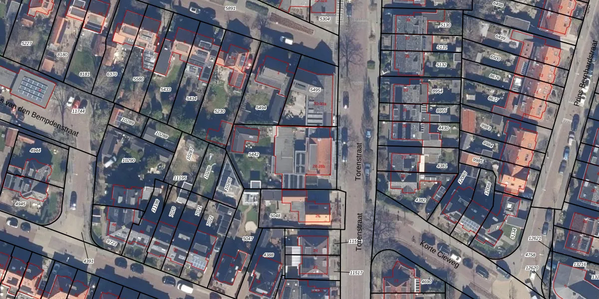 Het perceel waarop Torenstraat 28-a staat heeft een oppervlakte van 730 m². Dit is een groot perceel. De perceeloppervlakte wordt geregistreerd door het Kadaster. Gedetailleerde informatie over de maten van dit perceel kunt u vinden in het rapport Kadastrale kaart met maatvoering van Torenstraat 28-a.