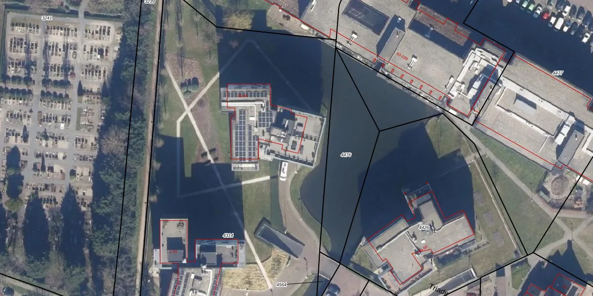 Het perceel waarop Triade 39 staat heeft een oppervlakte van 6925 m². Dit is een zeer groot perceel. De perceeloppervlakte wordt geregistreerd door het Kadaster. Gedetailleerde informatie over de maten van dit perceel kunt u vinden in het rapport Kadastrale kaart met maatvoering van Triade 39.