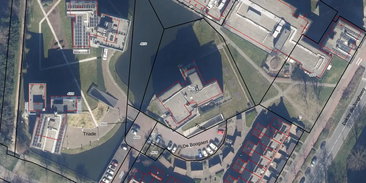 Het perceel waarop Triade 46 staat heeft een oppervlakte van 2635 m². Dit is een zeer groot perceel. De perceeloppervlakte wordt geregistreerd door het Kadaster. Gedetailleerde informatie over de maten van dit perceel kunt u vinden in het rapport Kadastrale kaart met maatvoering van Triade 46.
