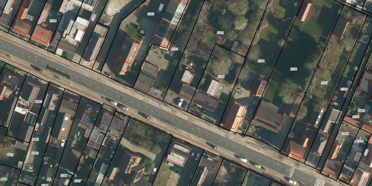 Het perceel waarop Bredaseweg 20 staat heeft een oppervlakte van 1814 m². Dit is een zeer groot perceel. De perceeloppervlakte wordt geregistreerd door het Kadaster. Gedetailleerde informatie over de maten van dit perceel kunt u vinden in het rapport Kadastrale kaart met maatvoering van Bredaseweg 20.