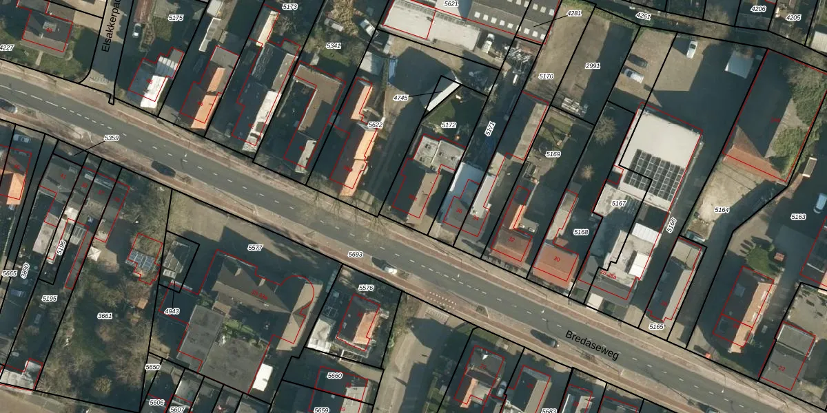Het perceel waarop Bredaseweg 36-a staat heeft een oppervlakte van 448 m². Dit is een groot perceel. De perceeloppervlakte wordt geregistreerd door het Kadaster. Gedetailleerde informatie over de maten van dit perceel kunt u vinden in het rapport Kadastrale kaart met maatvoering van Bredaseweg 36-a.