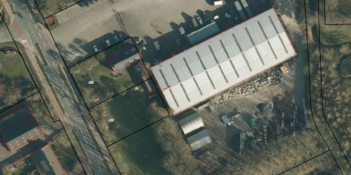 Het perceel waarop Bredaseweg 56-a staat heeft een oppervlakte van 2,4 ha. Dit is een zeer groot perceel. De perceeloppervlakte wordt geregistreerd door het Kadaster. Gedetailleerde informatie over de maten van dit perceel kunt u vinden in het rapport Kadastrale kaart met maatvoering van Bredaseweg 56-a.